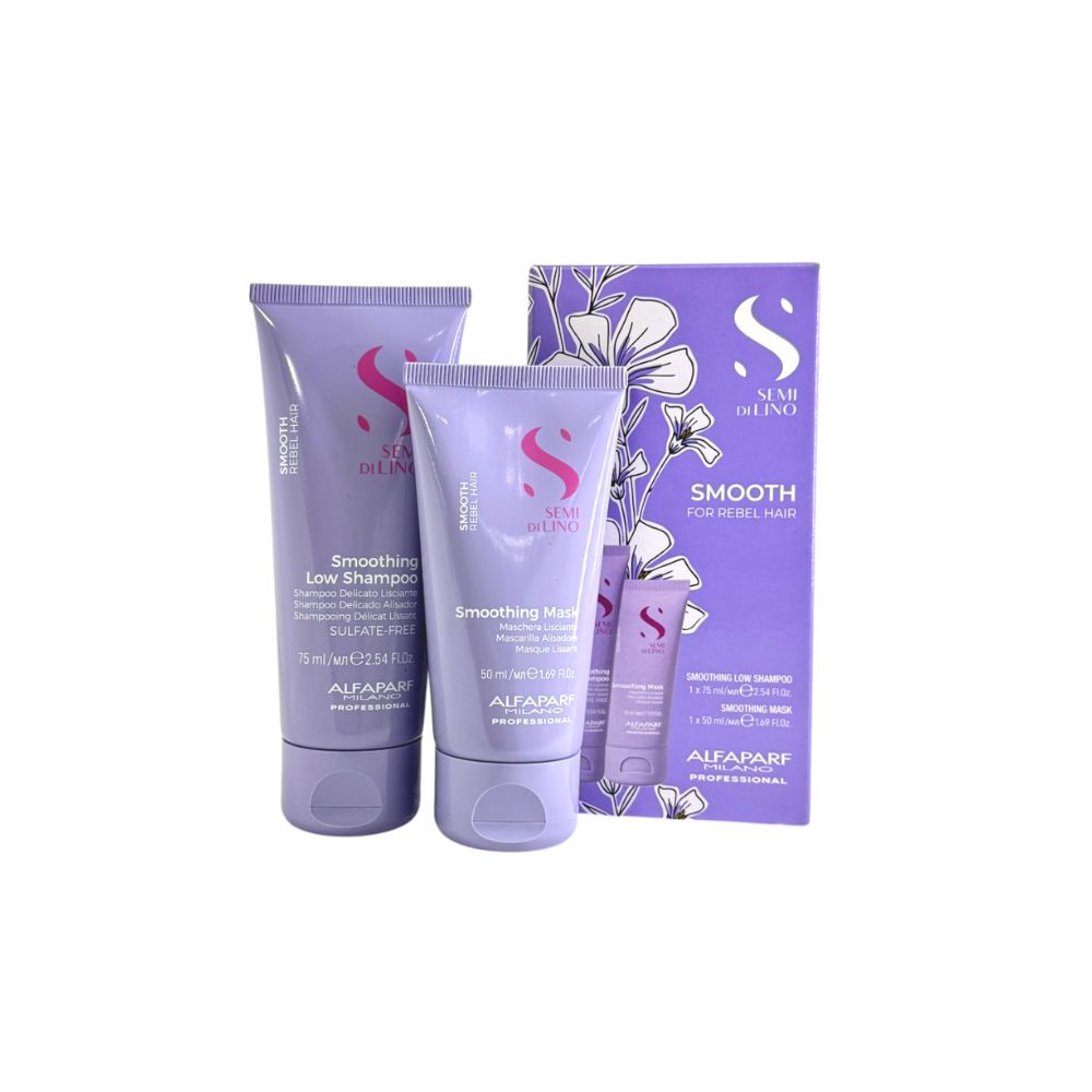 Alfaparf Kit Mini Travel Smooth despídete del frizz con Semi di Lino Smooth. Controla el encrespamiento, suaviza y disciplina el cabello rebelde con tecnología antifrizz profesional. ¡Luce un liso perfecto cada día!