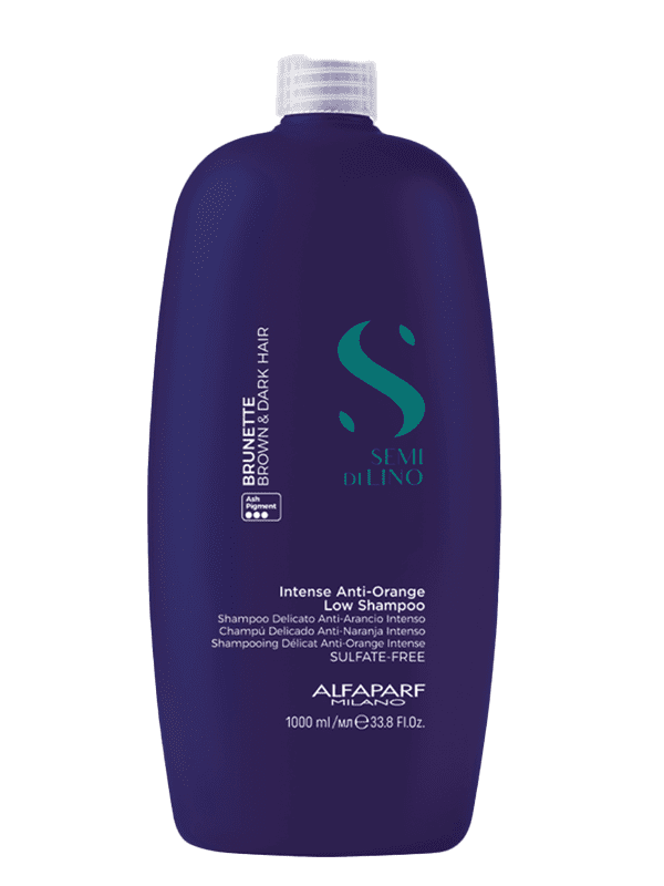 Semi di Lino Brunette – cabello castaño y moreno. Intense Anti-Orange Low Shampoo limpia suavemente y neutraliza los reflejos anaranjados no deseados. Aporta una nutrición profunda y revitaliza la fibra capilar con una acción intensa. Fórmula vegana.